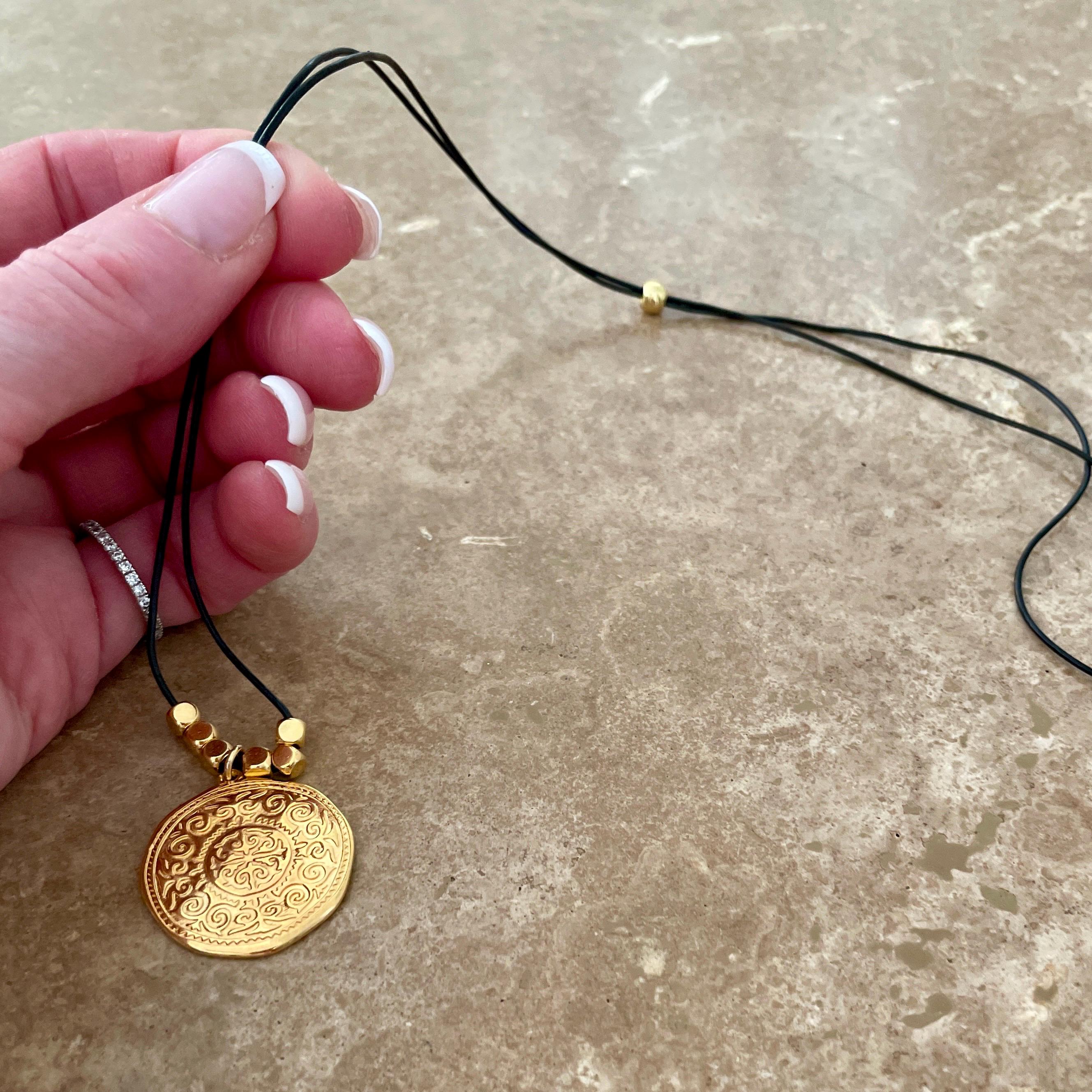 On trend boho style black cord necklace with gold coin medallion charm and beads.
