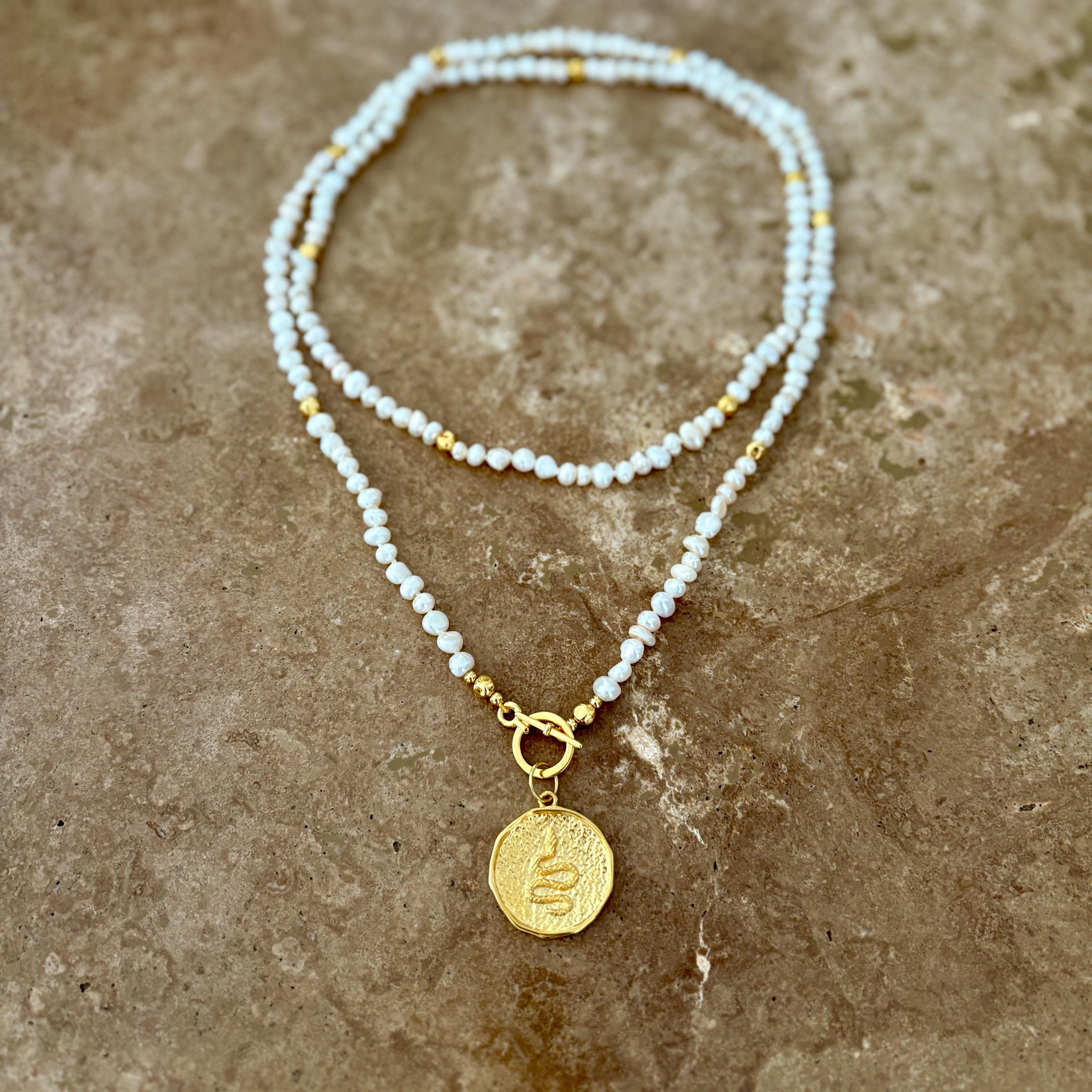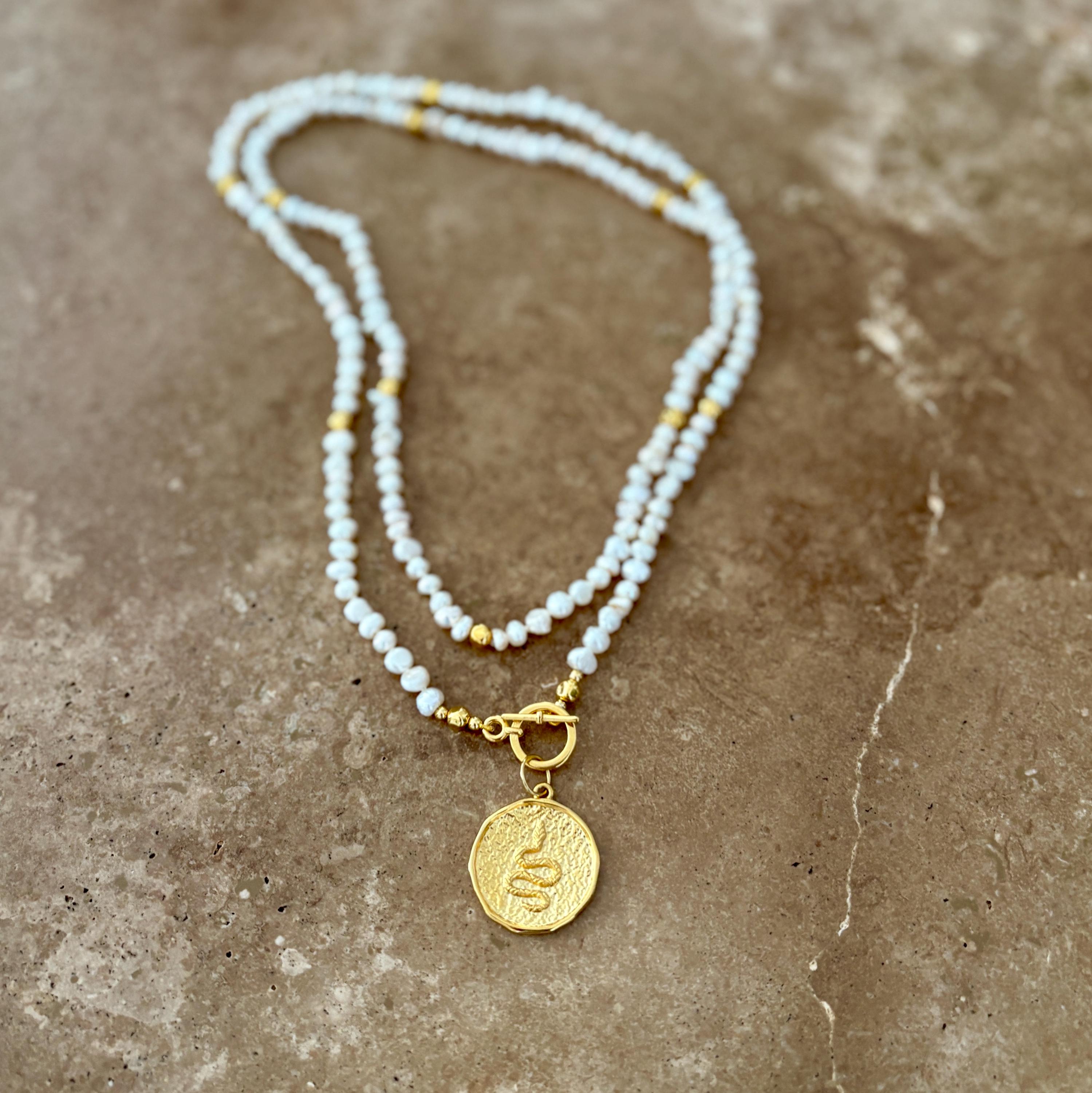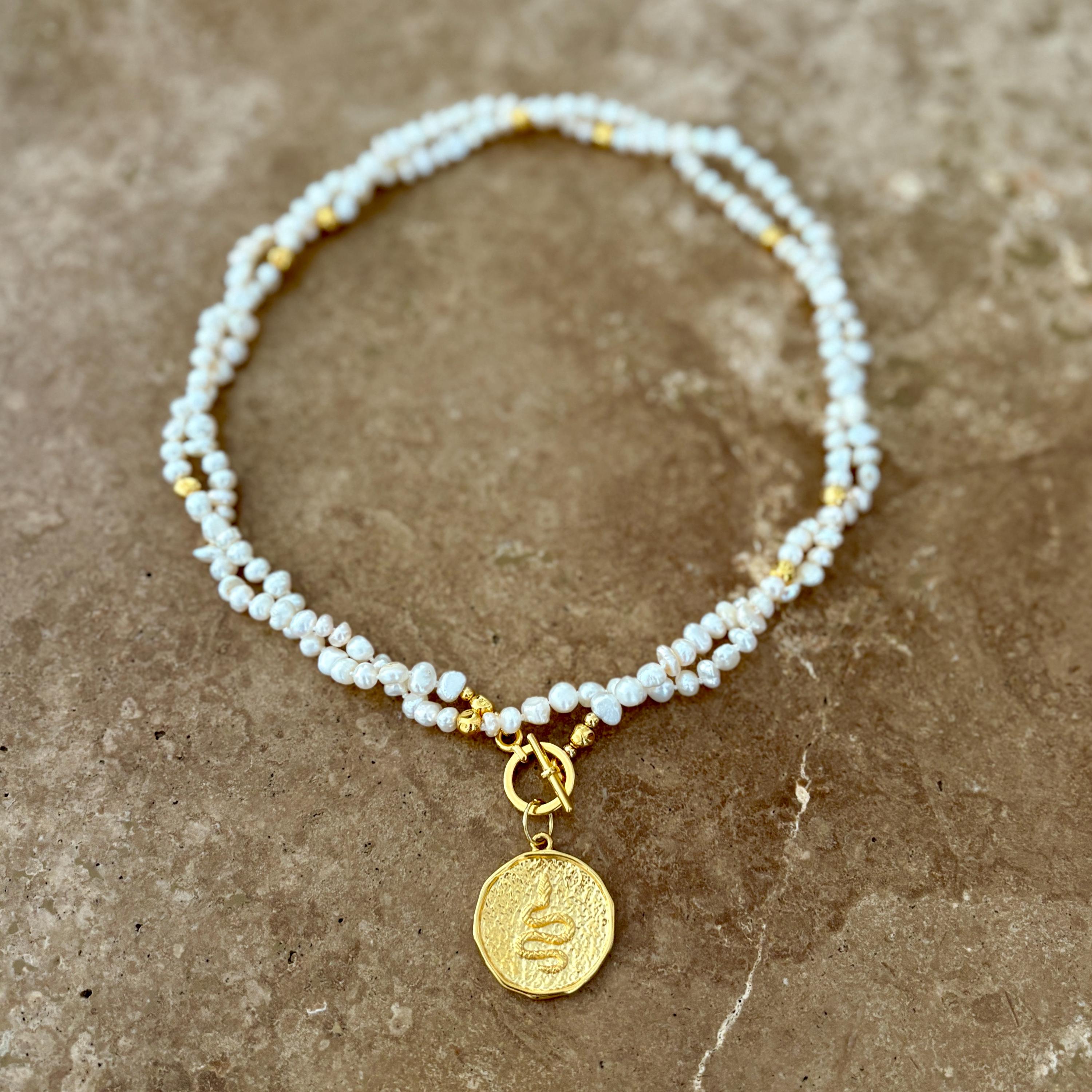 Freshwater pearl double wrap necklace with gold snake medallion