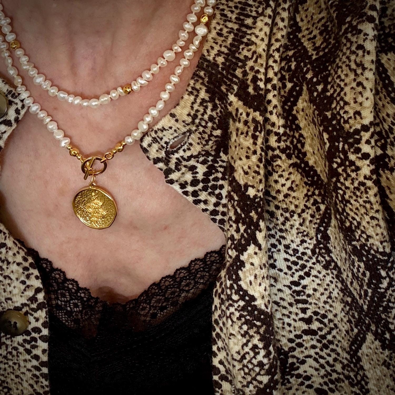 Boho style pearl wrap necklace featuring small irregular shaped pearl nugget beads finished with a gold plated T bar toggle clasp and medallion charm with serpent motif.