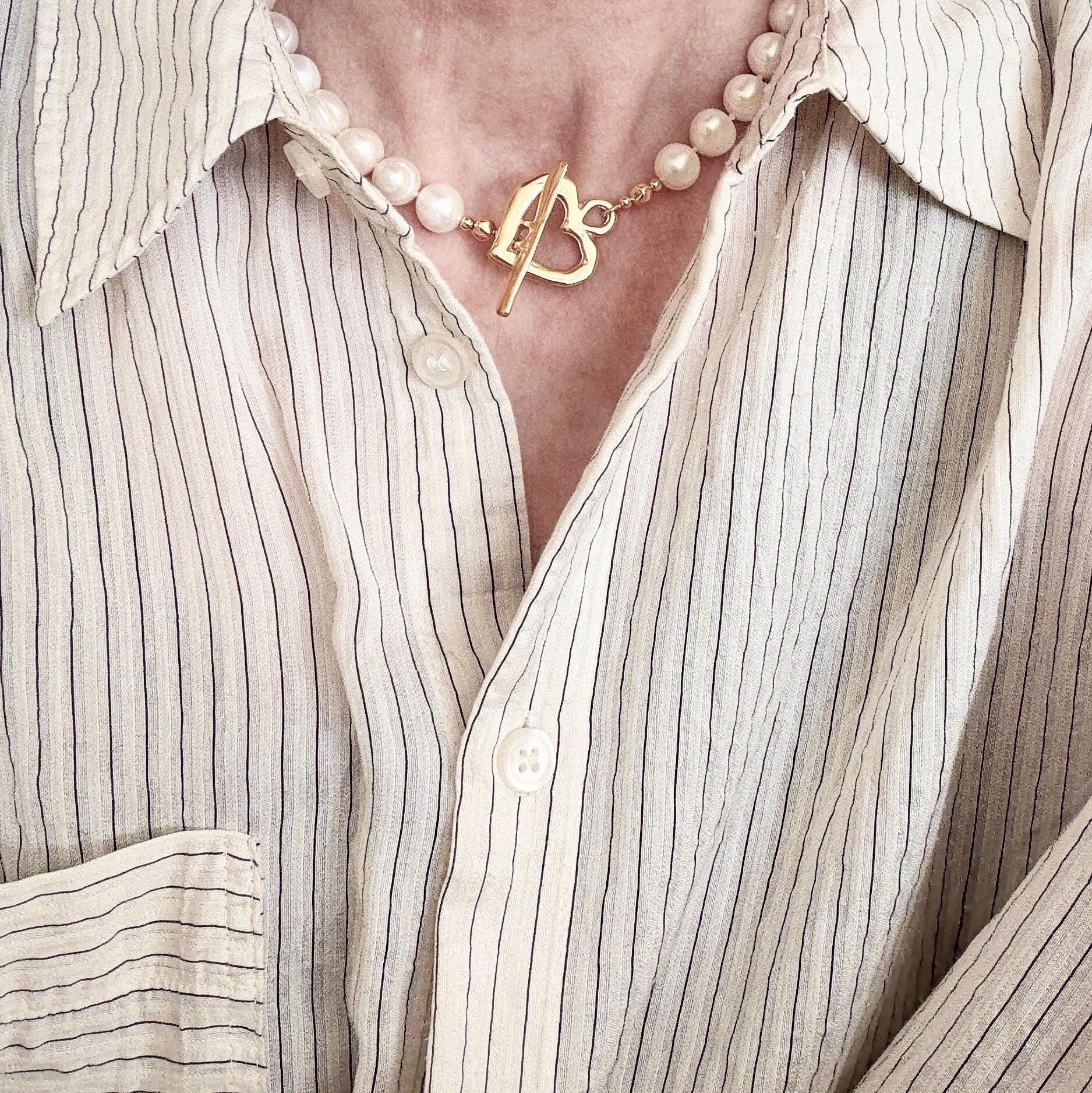 This stunning 90’s style fashion necklace features large 10-11mm freshwater cultured pearls finished with a chunky 24k gold plated heart shaped toggle clasp. It has been hand knotted for the best quality finish and designed in a shorter choker style length to sit comfortably just above the collar bone.